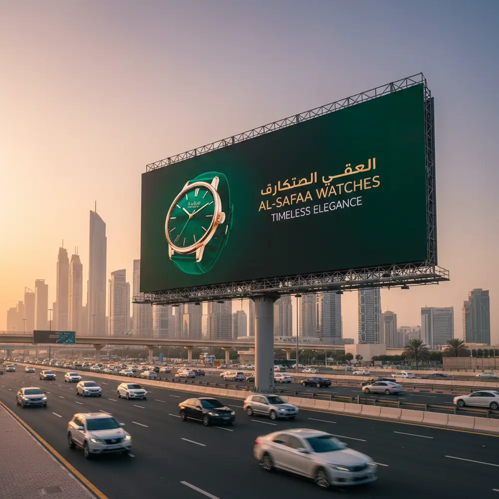 Billboard sizes are standardized based on their location. The “Unipole” (usually 18m x 6m) is common on major highways like Sheikh Zayed Road. “Lampposts” are smaller but offer high frequency in urban areas. The design must be scaled correctly to these dimensions to avoid distortion and ensure maximum readability from the intended viewing distance.